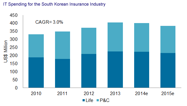 Celent estimates that IT spending in the South Korean insurance market will reach US$384 million in 2015, based on a compound annual growth rate of 3.0% from 2010 to 2015.