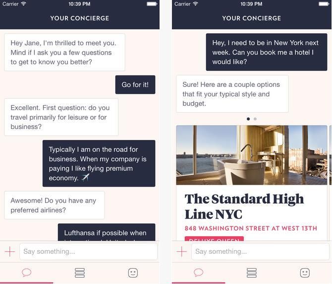 Last week I had the pleasure of going to Finovate, a biannual event (at least in NA) where startups and established vendors show off their newest creations. My colleague Dan Latimore wrote an in-depth piece about it last week. It’s usually a good temperature read of where the market is and what banks are thinking about. PFM used to be hot, now it barely makes an appearance. Mobile account opening and on-boarding was massive. Each year you can count on a few presentations tackling customer communication, whether it´s customer service applications or advisory tools. While this year was no different, I didn´t see any presentations representing an emerging trend in mobile: assistant as an app. What is assistant as an app? Basically, it puts a thin UI between two humans: the customer and the service provider (e.g. retailer or bank). The UI layer enhances the interaction by allowing each party to push information back and forth, whether its text, pictures, data visualization, etc. There are a wide range of possibilities. Apps are already starting to incorporate this idea. For a monthly fee, Pana offerings a human personal travel assistant who will take care of any travel related need. The concierge books restaurants, hotels, rental cars, and flights, all via in-app communication.
