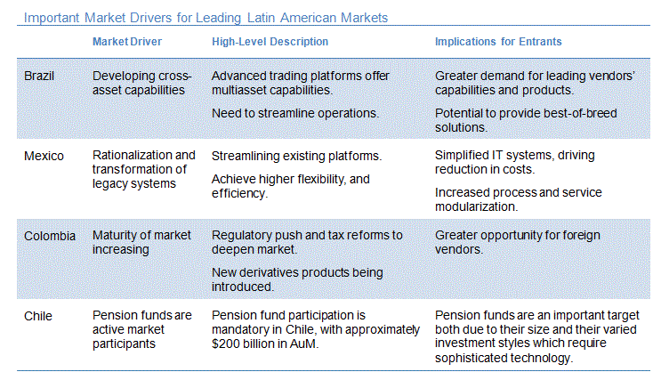 This is the first of a three-report series. It provides an introduction to some of the leading capital markets, namely, Brazil, Mexico, Colombia, and Chile, and compares them across parameters such as market and socioeconomic indicators, and size distribution of local brokerage and asset management firms. The report assesses the vendor landscape comprising international and domestic firms. The second and third reports of the series look at the Brazilian and Mexican markets, respectively. They provide an overview of the leading sell side and buy side players, market trends and characteristics, important market drivers, and the IT spending estimates.