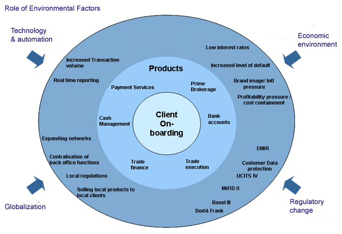 A number of factors affect the sophistication of the on-boarding process. These include the current technology available, the level of regulation involved, the economic environment, and the global presence of firms and their clients. Payment services, cash management, prime brokerage, and trade execution are examples of products that have more complex on-boarding processes.