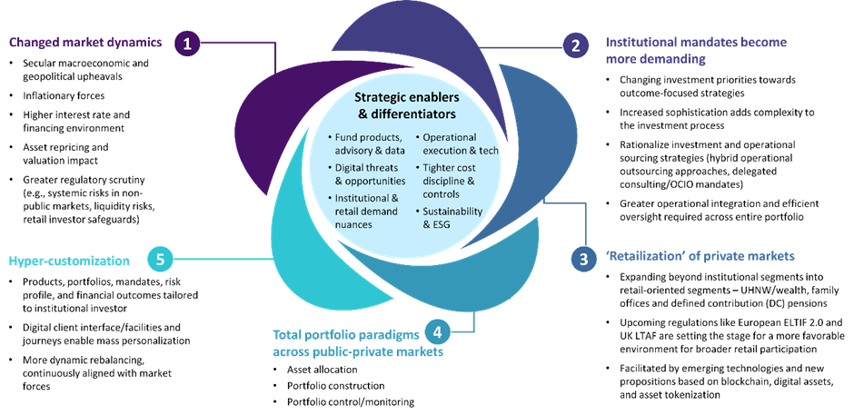 - Flexing nextgen technology muscles: Firms will require technology capital to drive smarter allocations into 'differentiated operational alpha' initiatives that accelerate data, software and solutions enablement in order to achieve greater operating leverage as new products scale. Emerging technology paradigms will create strategic ‘next wave’ opportunities for managers and investors, promoting the widespread adoption of private markets investing. At the same time, the significant uplift from technology and data enablement across all stages of private markets activities are increasing. Forward-looking firms are adopting a lifecycle-oriented approach to tackle operational and data challenges across front, middle and back-office operations. General partners (GPs) also need to build and enhance access to distribution channels to retail / high net worth and insurance clients (more likely than not, to leverage and embrace more extensive digitization paradigms).