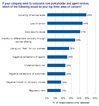 The key hurdles that vendors must overcome, even if they are more perception than reality, are shown in the figure. Software as a service is lagging a little behind BPO in most insurers’ minds, but they are cautiously anticipating that SaaS will gain strength.