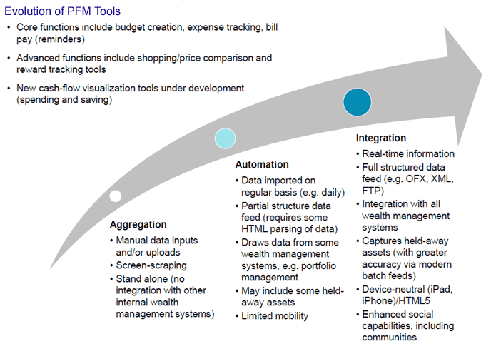 Celent focuses more on the segment’s position within the advice continuum, which extends from PFM to investment management to financial planning, and less on the functional aspects of PFM, which are closely aligned with online banking.