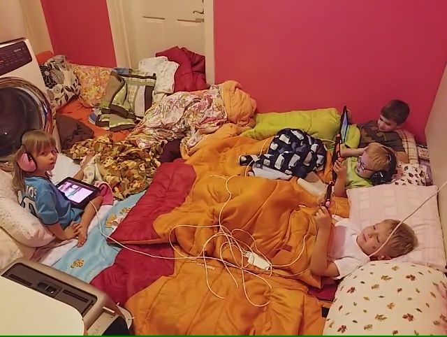 If you count, one child (our 11-year-old) was not in the room yet. He had to fit between the two blond boys on the right. That little spot beside the washing machine was for both me and my wife.