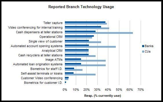 Celent fielded a survey among North American financial institutions in July to better understand the current state branch technology environment as well as likely midterm and longterm evolution. The results were surprising. [caption id="attachment_1781" align="aligncenter" width="563" caption="CUs Operate More Advanced Branch Networks"]