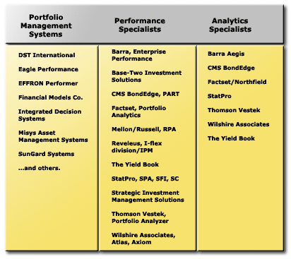 | Boston, MA, USA January 23, 2004 In a new report, " ," Celent compares eleven applications offered by leading investment performance attribution vendors in the U.S. and Europe. This report is a companion to Celents earlier report, "The Science and Art of Performance Attribution for Investing, Servicing & Marketing," which provides market overview trends. There are three types of investment performance attribution providers on the market today: portfolio management systems, performance specialists and analytics specialists. ![]() This report focuses on the performance specialists and compares their solutions features and functionalities. A future report will cover the performance attribution modules of portfolio management systems. Although all the categories compete with one another, the segmentation will help financial institutions understand the large number of providers with full and detailed coverage. "In 2004, vendors will launch new releases that completely upgrade system architecture and broaden functionality," says Denise Valentine, Celent analyst and author of the report. "Vendors will focus their attention on financial institutions."The following vendors were included in the study: Barra, Base-Two Investment Management Systems, FactSet Research Systems, Russell/Mellon Analytical Services, ReveleusA Division of i-flex Solutions, StatPro, Thomson Vestek, Wilshire Associates, Strategic Asset Management Solutions, and two fixed income specialists, CMS Bond Edge and The Yield Book. A is available online. | of Celent Communications' Retail Securities & Investments and Institutional Securities & Investments research services can download the report electronically by clicking on the icon to the left. Non-members should contact info@celent.com for more information. |