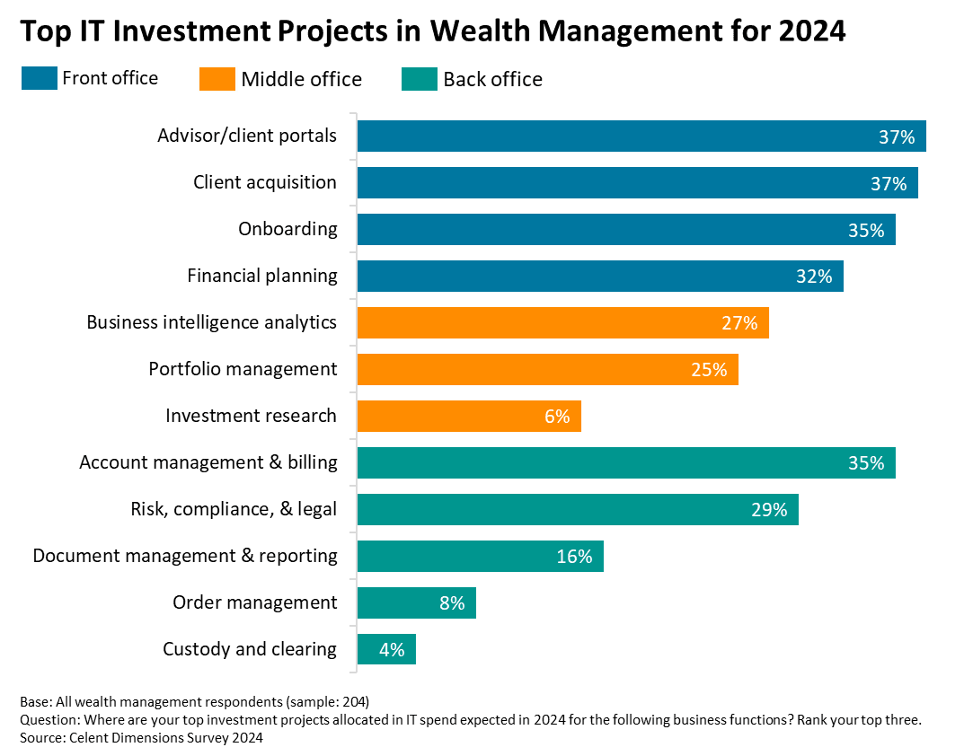 As part of the survey, we asked wealth management leaders to rank where their top three IT investment projects are for 2024. The most common answers were: