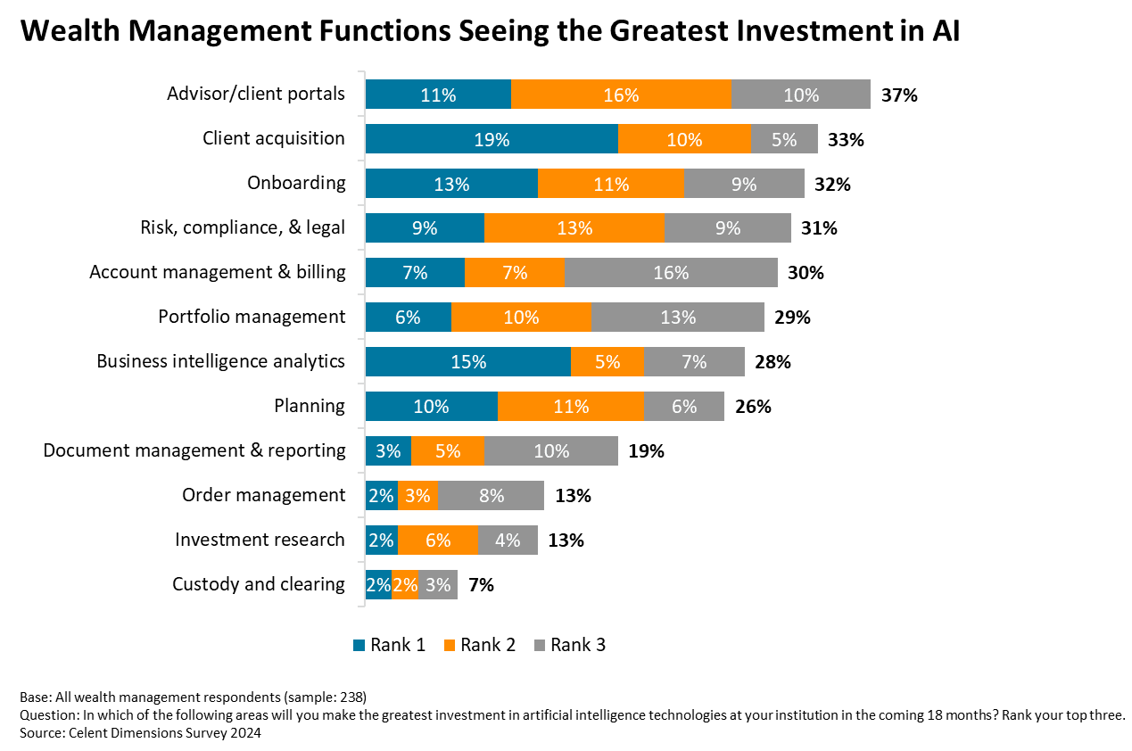 We asked wealth managers to rank their top three AI investment areas. The most common answers were the same front-office functions as above: advisor/client portals, client acquisition, and onboarding.