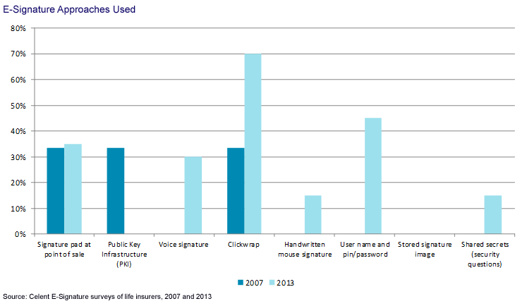 “Insurers understand the need to reduce cycle time, improve process efficiency, and meet the demanding attitudes of their agents and customers. Few insurers refute that these are service imperatives that must be addressed by a combination of technology, process improvement, and organizational discipline,” says Karen Monks, Analyst with Celent’s Insurance Group and author of the report. “Today, insurers are much more optimistic in their assessment of the value that e-signatures might bring to insurance processes, and one-third of survey respondents state that e-signatures are now a competitive necessity.”
