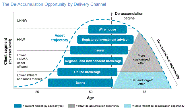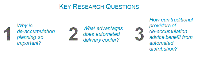Although automated delivery is disruptive to the standard advisory model, its impact should not be measured in terms of the disintermediation of the real life advisor. Decisions around de-accumulation are sufficiently complex (How best to transfer money to my children?) and emotionally freighted (Will I have enough to live on for the rest of my life?) as to demand face-to-face counsel, at least for the foreseeable future.