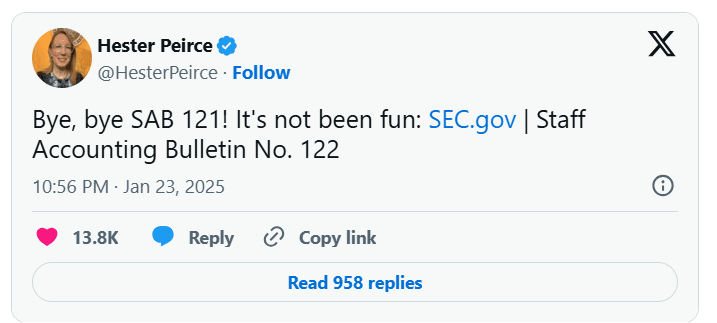 Firstly and perhaps the most immediately relevant for banks is the SEC’s repeal of Staff Accounting Bulletin (SAB) No. 121 that made it challenging, to say the least, for regulated banks to custody digital assets.SAB No. 121, effective from April 11, 2022, directed banks and other public companies to mark any customer’s crypt assets on their balance sheets. SAB 122 rescinds this guidance and directs firms to use Financial Accounting Standards Board rules or International Accounting Standard provisions.