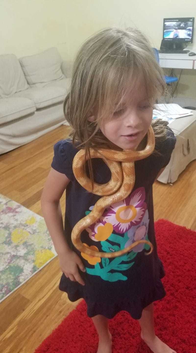 There is a story behind the snake. Our school district's learning center has a snake. We volunteered to foster the snake during spring break. The kids never went back. We now have a snake until school returns. Yay! Maybe. Clearly our 8-year-old daughter likes the snake.