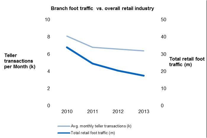 Banks and credit unions have been bemoaning the decline in branch foot traffic for some time now. In part, this is a result of widespread and accelerating consumer preferences for digital channel interactions. In a 2012 Celent survey of North American financial institutions (an effort we intend to repeat in 2014) , nearly half of respondents expected a 10% to 25% runoff over the next five years. Many expect a higher rate of decline.