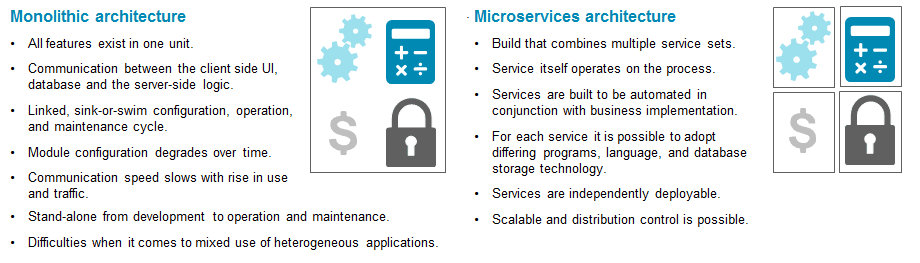 This approach to development is extremely amenable to the current environment characterized by the proliferation of online services and accompanying noise about fostering fintech partnerships. Indeed, the very concept and approach to development, operations, and maintenance of microservices is progressive. It also sits at the opposite end of the spectrum from the highly integrated monolithic core systems of Japanese banks — both the massive self-run, in-house megabank-operated systems and the shared regional bank systems.