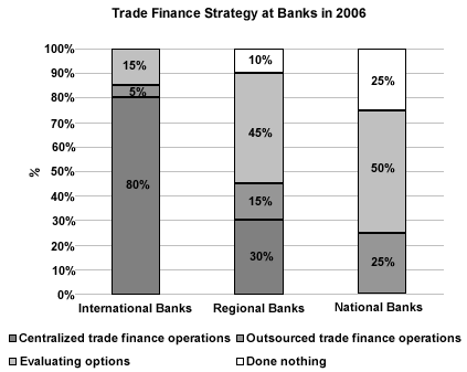 The banking community feels the winds of change in the trade finance business. Very few banks, regardless of their size, are doing nothing to change their trade finance operations. According to their future strategy regarding trade finance, banks have three main choices: centralising trade finance operations, outsourcing trade finance operations, or doing nothing.