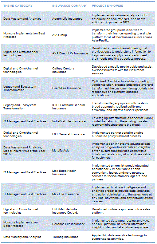 Nominations were accepted throughout 2015, and the Celent insurance team selected the winners based on the best practices and business benefits provided. Each Model Insurer Asia winner is described in a brief write-up within the report, including detailed descriptions of business drivers, technology environments, implementation details, and quantitative success metrics.