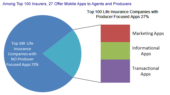 Twenty-seven of the top 100 life insurance companies have apps for producers. This is more than double the number of insurers that offered apps to producers in 2011.