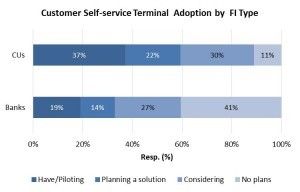 The idea of offering self-service solutions inside the branch remains a strangely controversial topic among North American bankers. This need not be. Self-service is rapidly growing across multiple retail market segments and has been a staple of Western Europe bank branches for a decade. Resistance among North American financial institutions is likely more cultural than pragmatic. As one community bank EVP stated in a recent research interview. “I’ll be damned if my customers are going to interact with a machine in one of my bank branches!”. O.K., so the topic is polarizing. But, is there a future for in-branch self-service in North America? We think so. Based on a Celent survey of North American financial institutions fielded in July 2012, in-branch self-service is destined to become somewhat commonplace – particularly among credit unions, who appear to be roughly twice as likely to adopt compared to banks. This should be a wake-up call to the curmudgeons who see no future in self-service based on the mistaken notion that consumers won’t be fond of the idea. [caption id="attachment_3194" align="aligncenter" width="300"]