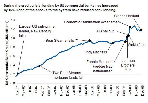 - Overall lending by US banks is at a record high and has increased during the credit crisis.