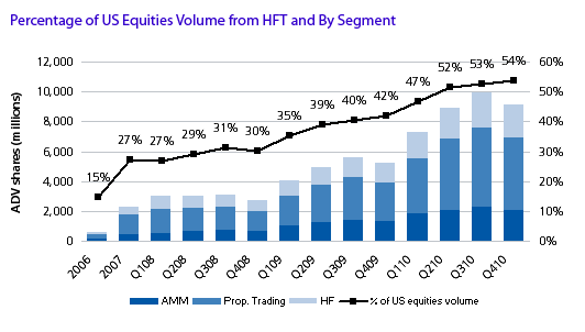 High frequency trading of equities has been a growing trend for some time, though the topic has been rediscovered of late. Enabled by regulatory change, an evolving market structure, and technological innovation in the trading arena, HFT now constitiutes about 42% of daily US equities share volume and is expected to exceed 50% by mid-2010.