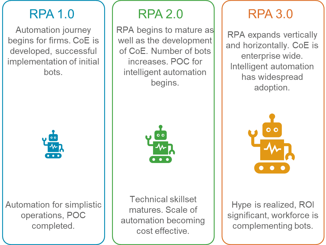Understanding RPA benefits and application builds the firm’s in-house muscle for future, more cogitative RPA solutions, i.e., intelligent automation enabled by ML and AI. These efforts break down barriers to address the heart of real transformation; end-to-end automation. RPA 3.0 is challenging to accomplish, but the rewards are what the excitement of RPA currently is about. The ROI of one bot can be very appealing but the ROI of a workforce of bots is what firms need to be cost-effective.