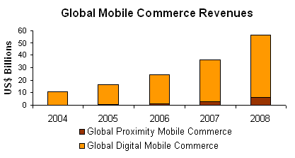 Celent predicts that mobile phones will become a more prominent vehicle for low value payments on a global basis, with global mobile commerce revenues surpassing US$24 billion in 2006 and $55 billion by 2008.