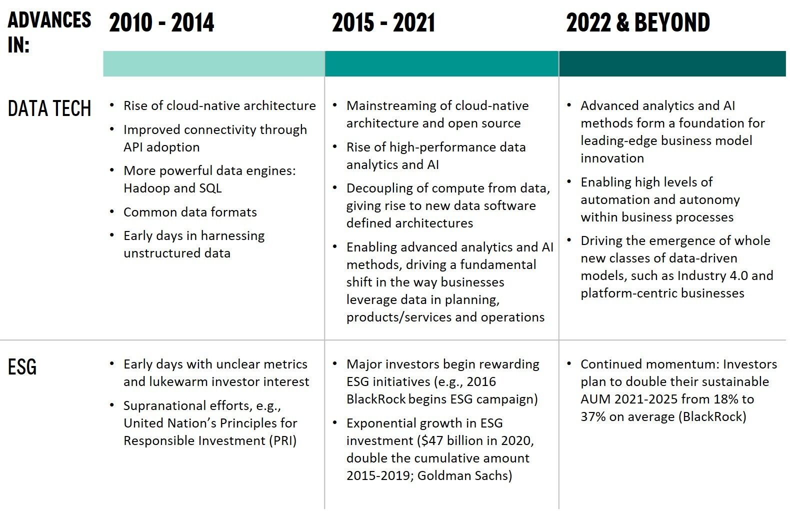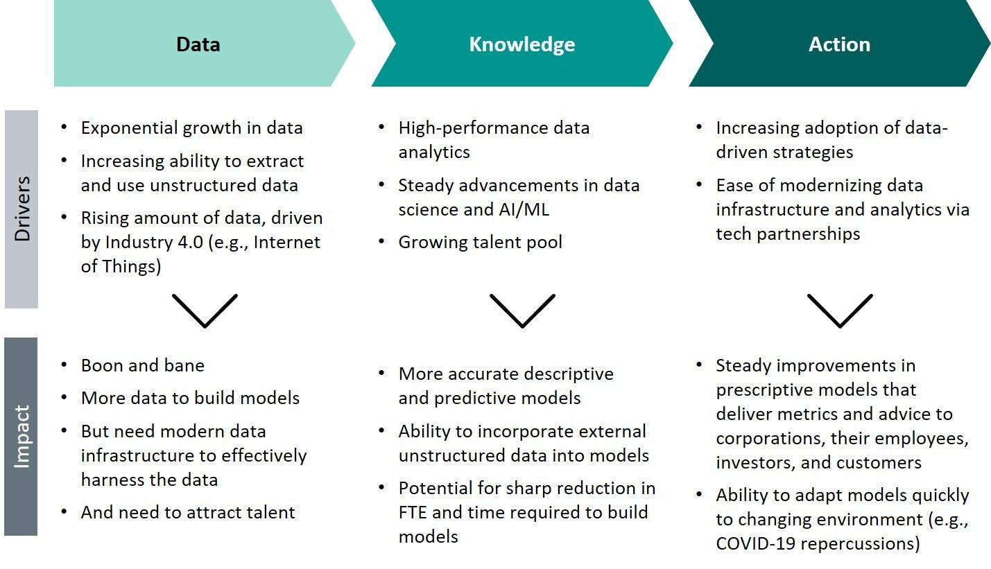 The quantity of data that businesses need to process has grown exponentially, and the data now originates from myriad sources, such as operational sensors (e.g., Internet of Things), financial transactions, unstructured data sources, and carbon emissions. Waves of digitalization, innovation, and competitive dynamics are driving this exponential growth. At the same time, achieving the 4 “Cs” of data—capture, clean, cache, and call—has become easier. Just as important as the tech advancements are the paradigm shifts: an increasing comfort with and use of cloud infrastructure, open source, and collaboration. In addition, corporations and investors are increasingly confident in the use of artificial intelligence and machine learning to gain insights and drive broad-scale automation.