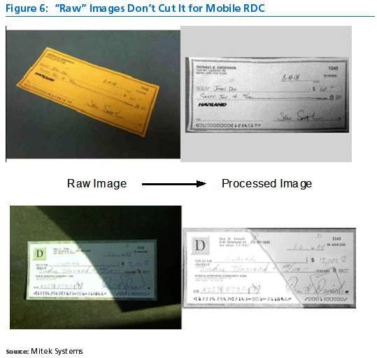 Making occasional check deposits using one’s cell phone camera is a great idea. Mobile RDC is a strong concept for its convenience, cost effectiveness and ubiquity. It’s a win-win for financial institutions and customers alike. Yet two things are causing FIs to move with extreme caution: risk and compliance. A recent Chase announcement suggests that mobile RDC may be easier said than done. Last week, Chase announced a relationship with Mitek Systems to provide mobile RDC capabilities to the bank across a variety of smart phone platforms. But, Chase had previously launched its service behind significant national television advertising buys. It’s a fun ad. The post-launch move to Mitek invites questions. Why? Why now? Chase first made its Quick Deposit service available to customers in July through an update to its app for Apple Inc.'s iPhone mobile banking platform. In November it rolled out the service to customers who use Google Inc. Android smart phones. Neither initiative utilized Mitek’s Image Prove technology. With a significant base of registered users, why change platforms now? Our guess is that the image analytics engine supporting the application wasn’t up to the task. This likely caused usability problems such as those experienced by Celent’s own Bart Narter (see Bart’s blog here). There’s nothing worse than getting all fired up from a good TV ad only to be disappointed with the app later on. OK, there are worse things. Producing consistently high quality images with low exception rates under conditions of widely variable lighting, contrast, camera angle, signal strength and steadiness of hand is not trivial. In Celent’s opinion, the key to achieving good performance with mobile RDC lies with skillful use of imaging technology. Maybe that’s why nearly all vendors of mobile RDC solutions employ Mitek’s stuff (with its resulting impact on product cost). Mitek’s Mobile Deposit addresses the high variability of mobile image capture with a real time sever-side image analytics approach it calls IMage- PROVE. The basic idea is to use image analytics to automatically and satisfactorily mitigate unwanted image variability so as to render the originally captured (e.g., “raw” image) usable for automated processing. In Celent’s view, this process (regardless of solution used) is key to Mobile RDC’s viability. Without it, both user experience and operational results would likely be unsatisfactory. The figure below shows the processing of such “raw” mobile images.