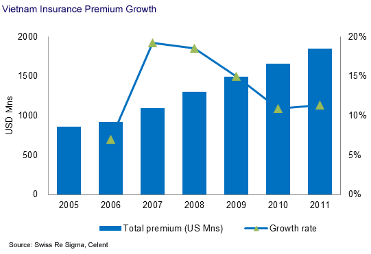 Vietnam’s insurance market has developed quite quickly. The compound annual growth rate (CAGR) from 2005 to 2011 was 13.6%. Nonlife premiums increased at a CAGR of 19.5% from 2005 to 2011, more than twice the rate of life insurance premiums. In recent years, however, the growth rate has slowed.