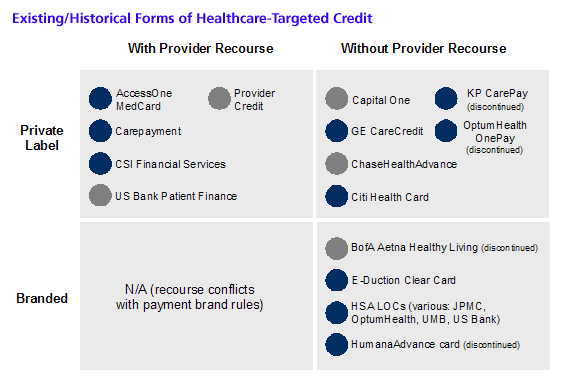 - Going forward, healthcare credit targeted at creditworthy populations will need to generate value via a trade-off between reduced healthcare provider receivables aging/bad debt and card spending rebates.