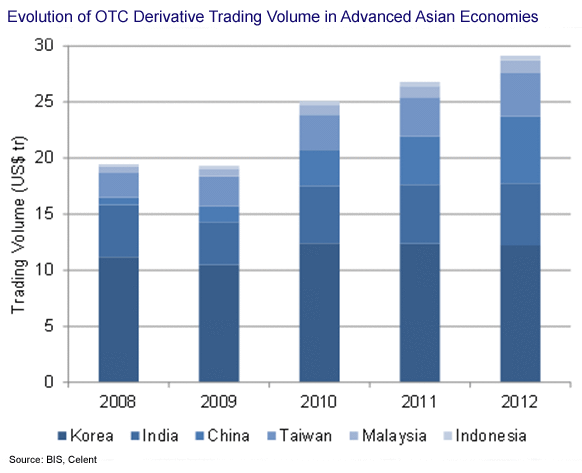 The OTC derivatives markets in the six emerging Asian economies – China, India, Indonesia, Malaysia, South Korea and Taiwan – are small and highly localized. While these six economies accounted for 61% of the total GDP, 68% of international trade, and 57% of equity trading in Asia in 2012, their share in OTC derivatives turnover was less than 10%.