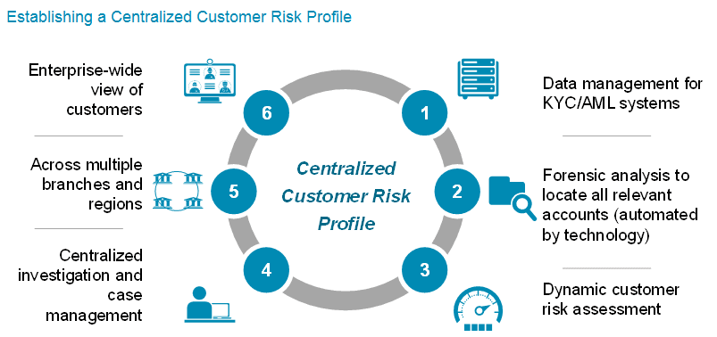 To meet these challenges, firms should implement a holistic approach to AML compliance in order to capture a consolidated and coordinated view of customers and activity across lines of business, products, and regions — including state and, for multinational institutions, national borders.
