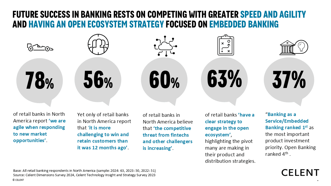 ·Improve the way you compete every year. 56% of retail banks in North America report that ‘it is more challenging to win and retain customers than it was 12 months ago. With agility, competition from incumbents and challengers is increasing. This requires new responses, such as product distribution through new channels (embedded finance) that your clients and prospects are using.