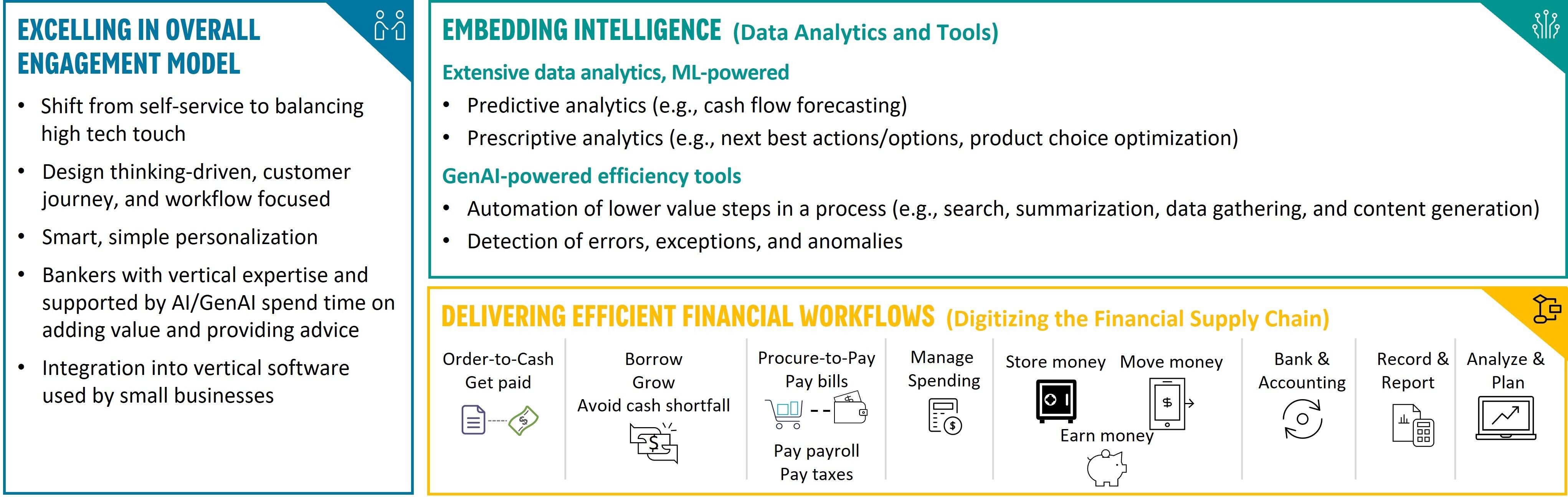 Pacesetters profiled, for overall: American Express, LiveOak Bank, and Starling Bank. For delivering efficient workflows: TD Bank, United Community Banks (the latter two have partnered with Autobooks), Pocketbook, and Square. For embedding intelligence: Eastern Bank (partnered with Monit) and Xero.