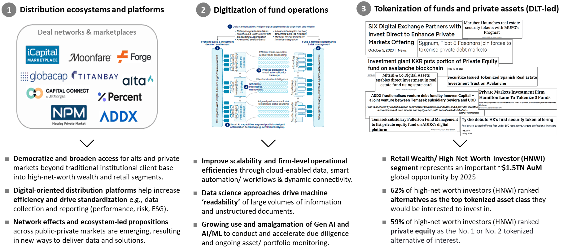- Retail demand for alternatives and private markets will be facilitated by the confluence of developments across several fronts: Modern distribution ecosystems, digitization of fund operations, and tokenization.