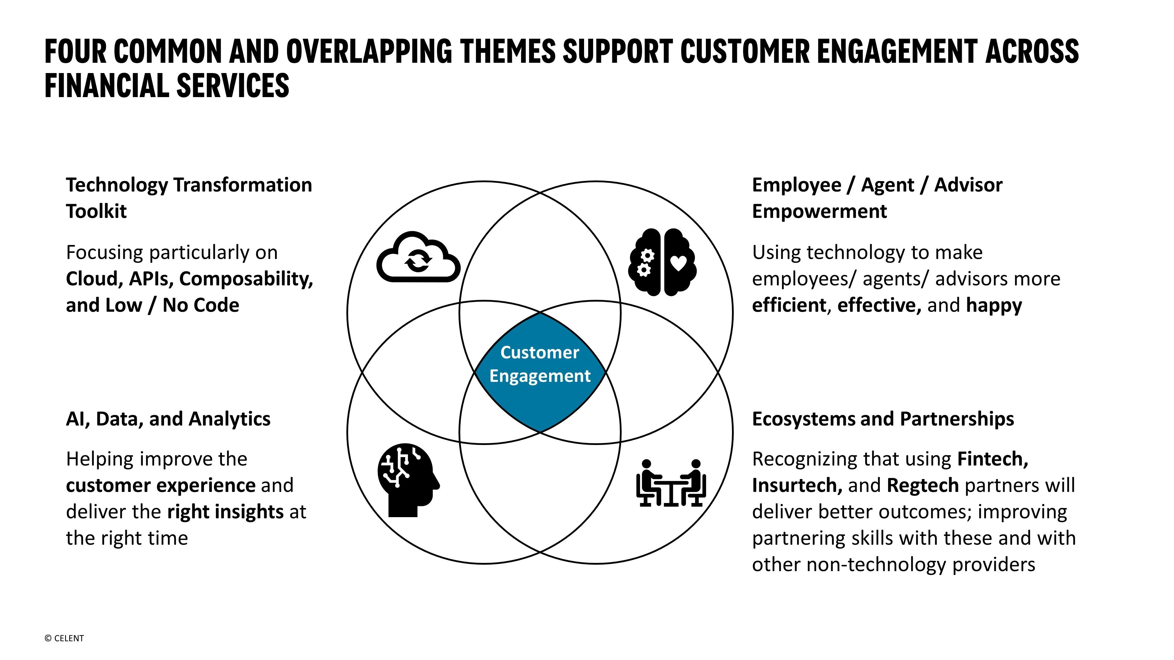 By now you’ll have seen our industry specific Previsory reports and webinars, deep dives into the technology trends that different sectors of Financial Services should be focusing on in 2022. What’s interesting, though, is that common themes have bubbled up across this research, all supporting a central theme of Customer Engagement, itself the subject of extensive Celent work over the last year.