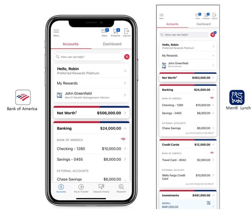 Above: Each Bank of America app displays common, personalized product and service tiles with a unified design.