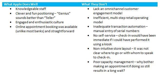 Apple Store – Perimeter Mall, Atlanta, GA[/caption] Wisely, I called the store before making the trip. The extremely friendly and knowledgeable Apple rep on the phone politely reassured me that I could have a new phone for $199 + tax as long as I still had my previous phone and was willing to leave it at the store. All I had to do was make an online appointment and check in at the Genius Bar once there. Simple enough, but why didn’t the Apple rep make an appointment for me while I was on the phone? I strategically planned an appointment on a Thursday afternoon, thinking it best to avoid weekends, particularly for a retail mall based store before Christmas. Arriving at the store, I found it a bee hive of activity. The relatively small store must have had 60 people in it. After checking in, I was asked to sit at an apparently random bar stool. Ten minutes later another Apple employee greeted me, verified my identity, confirmed the purpose for my visit and politely asked me to move to a second bar stool deeper into the store. Why couldn’t the first person meet my very simple need?