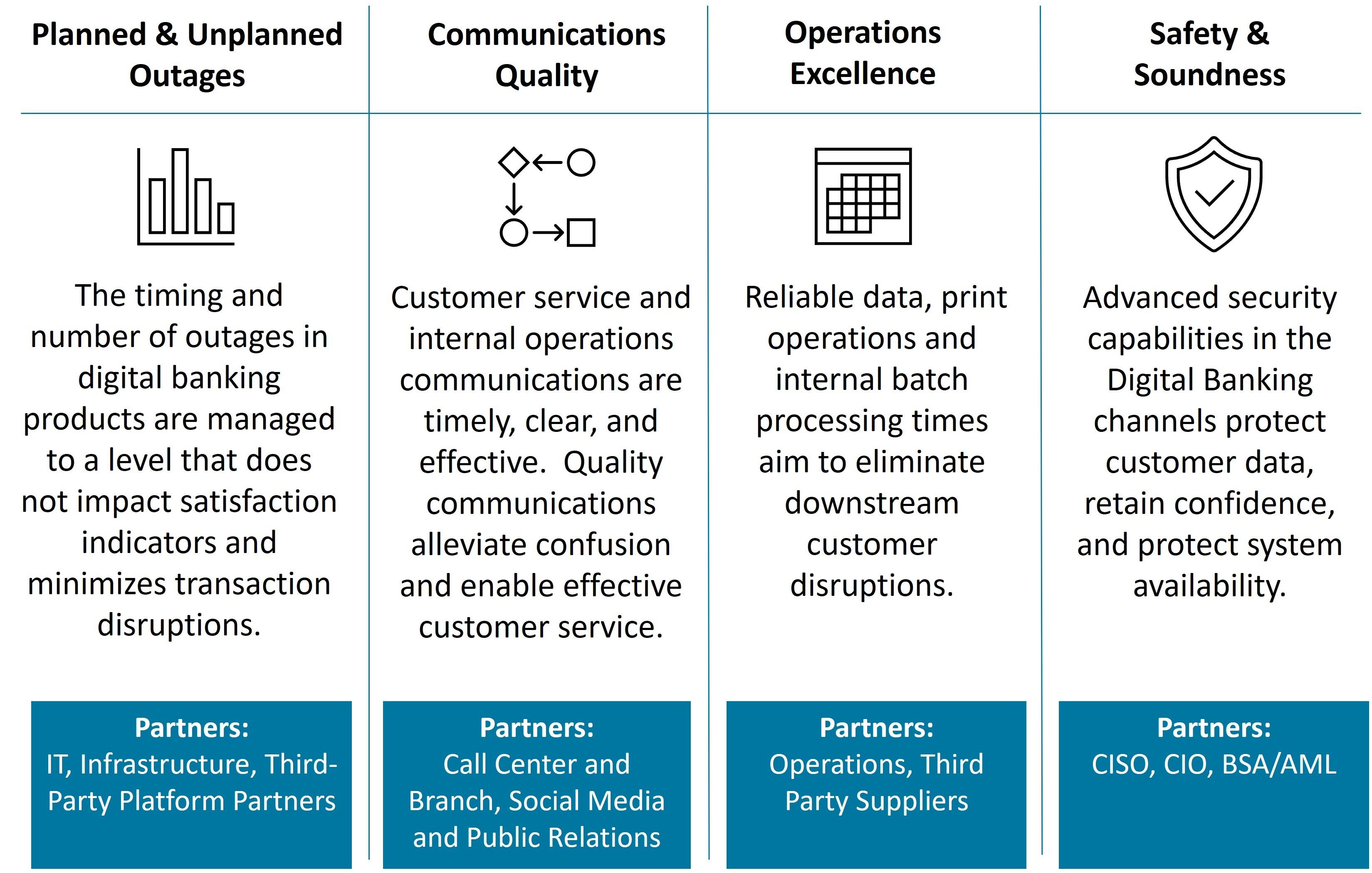 Availability starts with digital banking stability and performance but expands into communications quality and timeliness, operations reliability including third-party processors, and security, safety, and soundness initiatives. All of these ladder up to a highly available customer experience that reduces transaction delay, deferral, or deflection.