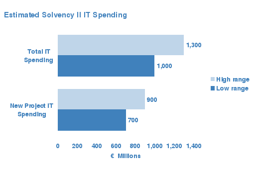 Overall, Celent estimates that European insurance companies allocate between €700 million and €900 million for new IT projects in order to comply with Solvency II. European insurers currently spend 4%, on average, of their IT budget on compliance. €In addition, they typically spend 40% of their IT budget on new projects and an estimated 7% of that on compliance projects. With the implementation phase of Solvency II approaching the effective date, Celent believes that insurance companies will allocate more money for new IT projects in the fields of compliance and control. The IT budget for these new projects will continue to grow in the next three to four years.