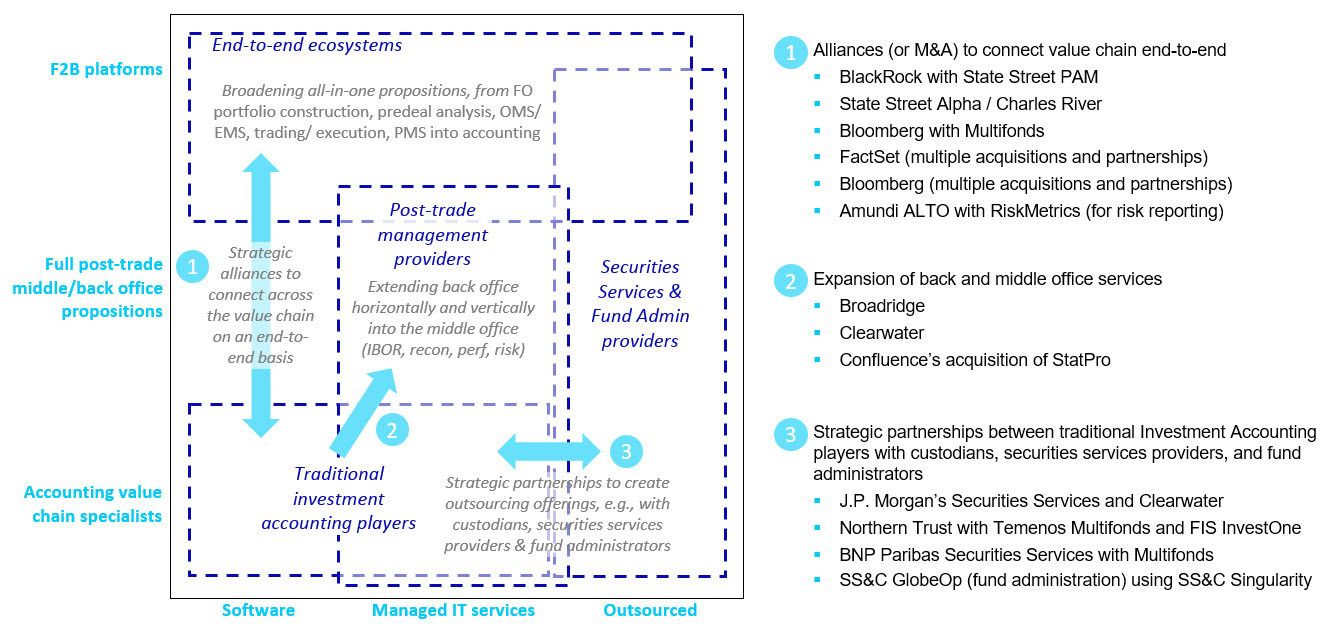 Shifting end-user demands toward fewer strategic vendor relationships are pressuring vendors to connect more broadly with other providers. Throughout the value chain, we observe service providers form/extend partnerships in order to prepackage and prebundle their offerings in conjunction with others (e.g., for esoteric asset pricing models, conventional and alternative datasets, news/sentiment, and AI-powered analytics). Here, modularization enables the unbundling/rebundling of products/services. In addition, interoperability—for example, through microservices and open APIs—can help facilitate collaborative partnerships and continued digitization of the investment value chain by employing modularized offerings to create new propositions and innovations.