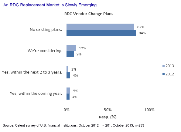 As the race to market with remote deposit capture solutions moves from commercial to consumer mobile, some banks are rethinking what they already have installed. As of 2013, barely 10% of US financial institutions offer mobile RDC (mRDC) to consumers.