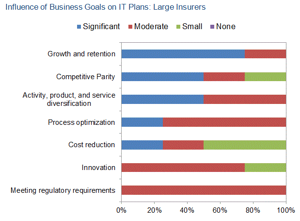 “CIOs in all segments identify the business goal of growth and retention as the most important influence on their IT plans,” says Donald Light, research director with Celent’s Insurance practice and author of the report. “Process optimization is a strong influence in all segments. However, CIOs in different segments vary considerably in their evaluation of the other business goals. For example, reaching diversification of activities, products, and services is quite important to large insurers, but not to midsize and small ones. Cost reduction is close to top of mind for midsize and small insurers.”