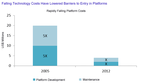 In the report Institutional FX Market: Changing Business Models and Evolving Market Structure, Celent looks at the motivation for the launch of new FX platforms and analyzes how the barriers to entry for building a platform have fallen in the recent past, enabling more competition in the market. Barriers to entry and barriers to success in the market are two different things, and Celent analyzes how new platforms will survive in this changing market and how incumbents are addressing increased competition.