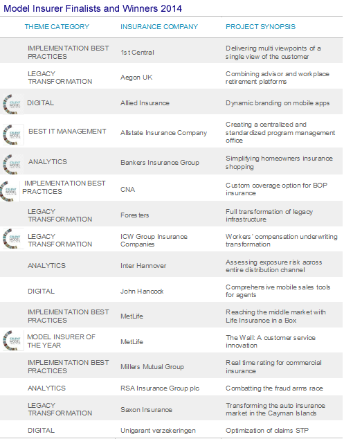 In a new report, Model Insurer 2014: Case Studies of Effective Technology Use in Insurance, Celent recognizes 15 insurance technology initiatives profiled as Model Insurer finalists and winners in the theme categories of digital, legacy transformation, implementation best practices, and data analytics. The report also names MetLife the Model Insurer of the Year. The case studies highlight best practices in the use of technology in insurance in areas such as policy administration, IT management, claims, and distribution. The report also reviews IT best practices and measurable business results used in evaluating the Model Insurer winners and finalists.