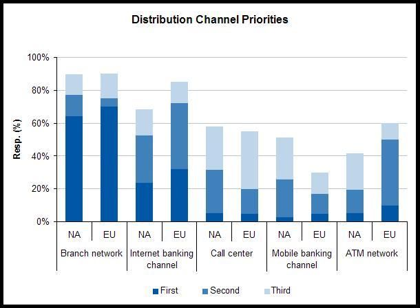 [/caption] I’d like to offer a few observations and invite your comments. In both regions: • Multichannel investment is a high priority • Branch channel remains the highest priority, closely followed by the internet channel. Interestingly, branch channel priorities are nearly identical across the two regions. • Mobile banking is the lowest priority channel However, there are several significant differences. Specifically: • The ATM channel is a much higher priority among large European banks than it is among the US sample. 50% of the EU banks rated the ATM channel #1 or #2 in priority compared to just 19% among large US banks. • The mobile channel is a comparatively low priority among EU banks (17% placing mobile banking among the top-2 priorities versus 26% among large US banks). Now, two questions for our readers. Feel free to post a comment or e-mail me directly at bmeara@celent.com if you wish to weigh in off the record. 1. Why is the ATM channel such a comparatively high priority among EU banks? 2. Conversely, why is the mobile banking channel such a comparatively low priority? I’ll post a summary of responses along with a Celent/Oliver Wyman position next week.