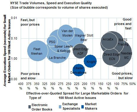 In this report, Nasdaq MC (Nasdaq Market Center) achieved the best prices, whereas BATS Trading retained its top speed ranking in this study among major electronic order books. In the market maker category, E*Trade Capital Markets achieved the best prices for client orders, while Knight executed incoming orders at the fastest rate. With Susquehanna dropping its services and Van der Moolen being bought over by Lehman Brothers (now Barclays Capital), there has been a shakeup among the NYSE specialists. La Branche and Van der Moolen ranked first among their peers in the cumulative price and speed tables.