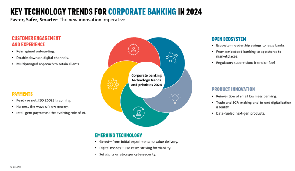 Celent’s guidance to clients is around five key industry themes and 15 corporate banking technology priorities for 2024 and draws on some of our recently published insights, but much of the content is new, published here for the first time.