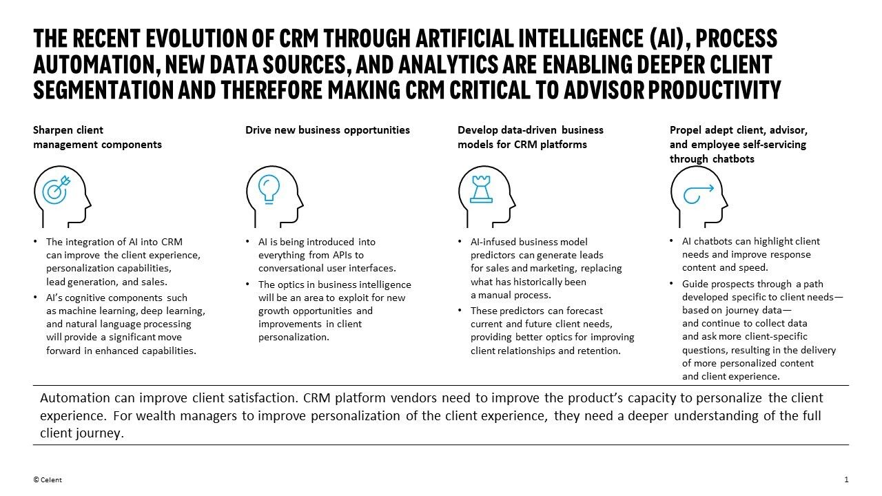 CRM solutions powered by AI have become a game-changer for the wealth management industry, empowering professional wealth managers with advanced tools and capabilities to deliver superior client experiences. AI-driven CRM systems can analyze vast amounts of client data, including financial information, investment preferences, and communication history. This enables wealth managers to gain deeper insights into client needs, behaviors, and goals, allowing for more personalized and targeted client interactions. By leveraging AI algorithms, CRM solutions can provide wealth managers with enhanced client insights, enabling them to offer tailored investment strategies and products that align with each client's unique financial objectives. This level of personalization not only strengthens client relationships but also helps wealth managers deliver more effective and relevant advice.