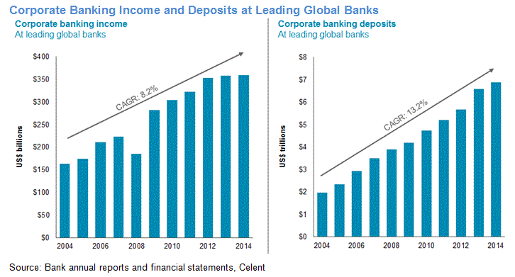 In the report Corporate Banking: Driving Growth in the Face of Increasing Headwinds,Celent looks back on corporate banking performance over the past 10 years, a period of both tremendous growth and unprecedented upheaval. Corporate banking operating income and customer deposit balances have experienced healthy growth rates over the past 10 years. But in the past few years, despite increases in customer deposits, corporate banking income was stagnant.